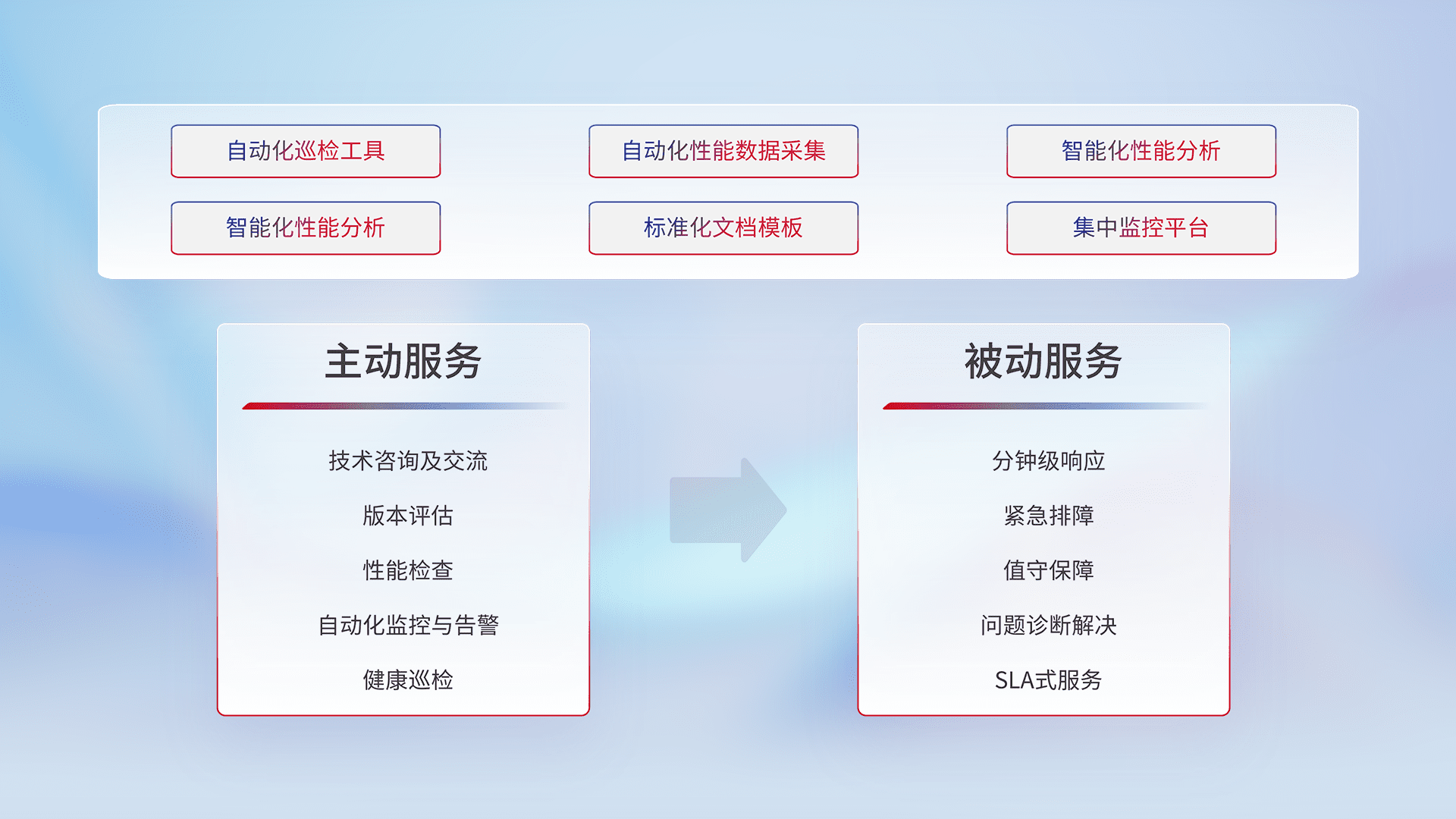 智能化工具和标准化文档,,,保障服务质量,,,,提供主动服务(包含技术咨询、、版本评估、、、、性能检查、、自动化监控与告警、、、健康巡检)和被动服务包含(分钟级响应、、、、紧急排障、、、、值守保障、、、问题诊断解决、、、、SLA服务)。。