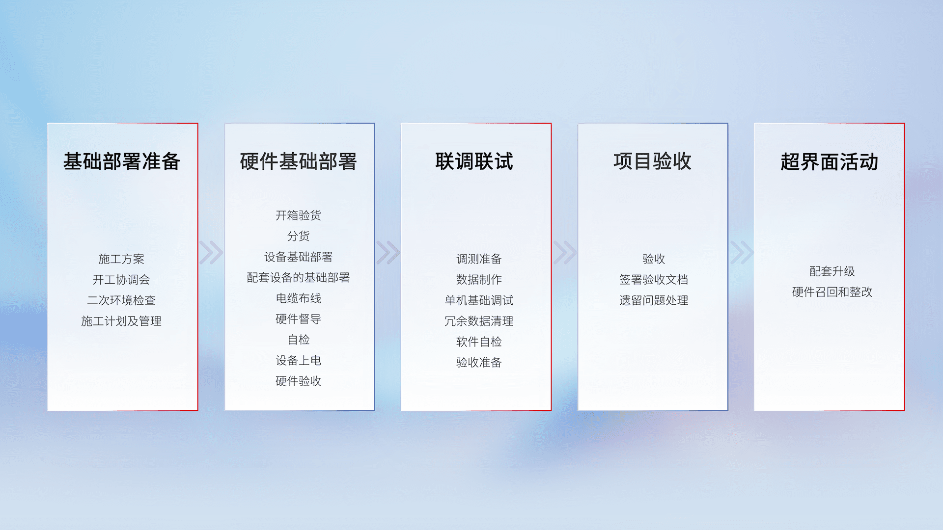 从基础部署准备、、、、硬件基础部署、、、、联调联试、、、项目验收、、、越界面活动的全过程可追溯,,,,保证施工质量和进度。。